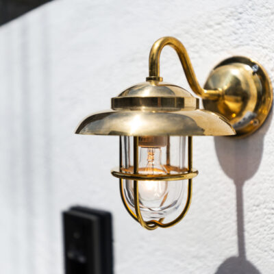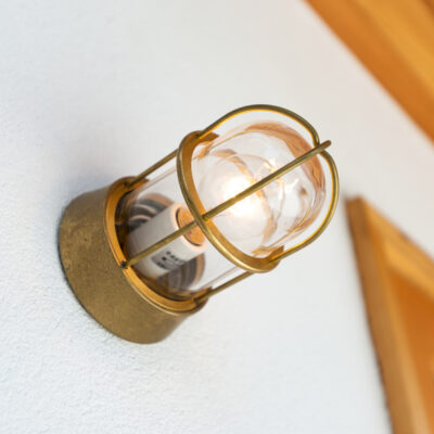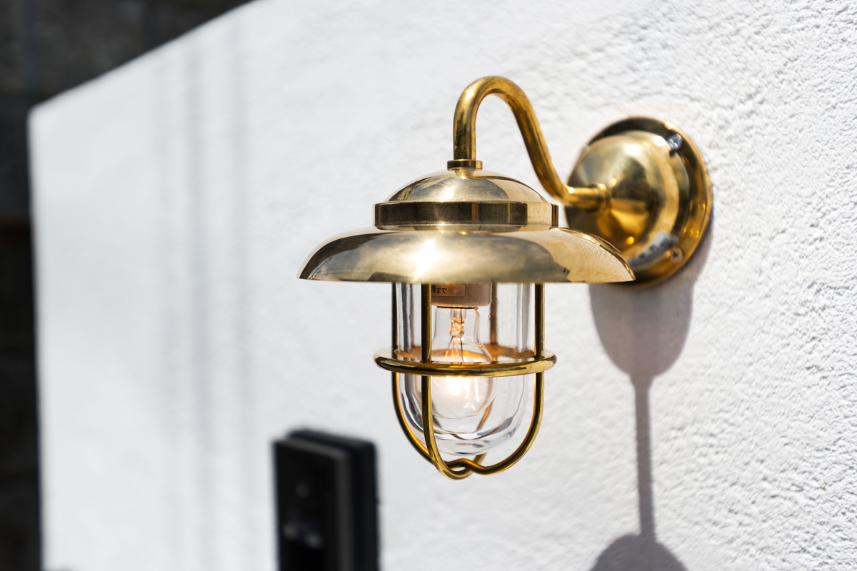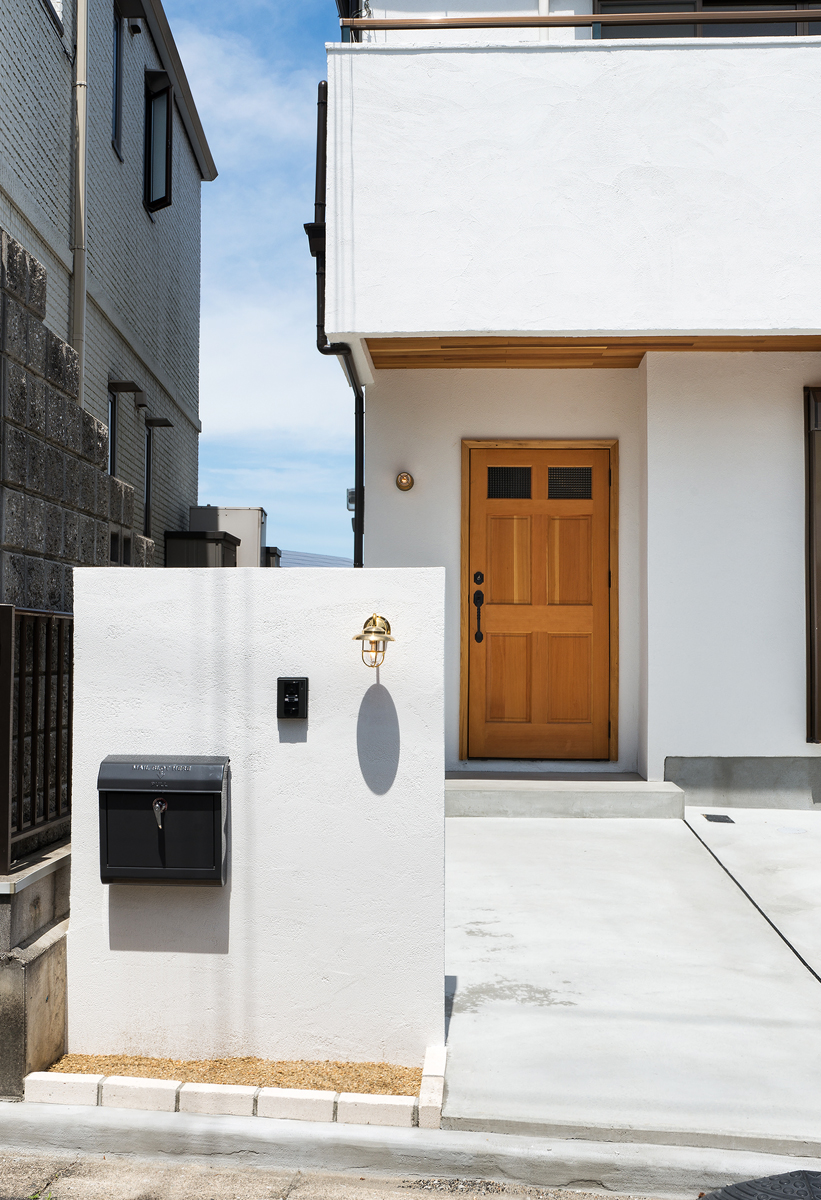 住まい全体に自然素材を取り入れ、心地よさと機能性を両立させた空間づくりを行いました。外観では、外壁をしっくいに塗り替え、調湿性や耐久性に優れた自然素材ならではの質感と風合いを演出。無垢材の玄関扉に交換することで、温かみのある重厚なエントランスに仕上げました。また、新設した門柱や門灯・船舶ライトの2か所の照明器具配置により、外観のデザイン性を高めています。