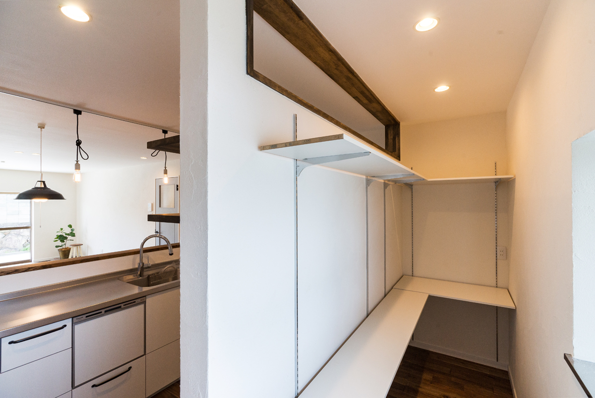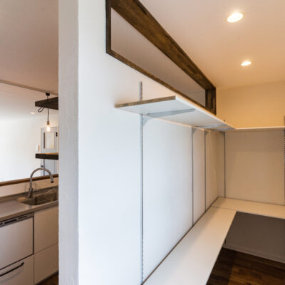 内部では、水回り設備を最新のものに交換するだけでなく、キッチンを前面に移動。背面に壁を起こし、パントリーを新設しました。リビング・ダイニングのフローリングには、無垢材を使用して足触りや肌ざわりを重視。木材特有のぬくもりと香りが空間全体に広がります。壁紙には自然素材由来のクロスを選び、調湿性や健康面にも配慮しました。